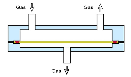 Test principle: Specimen divides the cell into two independent chambers, and vacuumize the both chambers to certain degree. Introduce test gas into the upper chamber (or the high pressure side) till the absolute pressure reaches 0.1 Mpa, while the other chamber (or the low pressure chamber) remains in vacuum. Thus a o.1 Mpa pressure difference is formed. Test gas passes through the film into the low pressure chamber, causing the pressure change. Use high-precision pressure sensor to measure the pressure change in the low pressure chamber, and further determine the gas transmission rate (GTR).